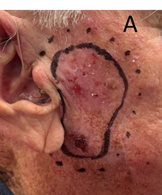 A Planning photo of an elderly man with symptomatic actinic field change anterior to the left pinna that had grown invasive disease. A lesion within the area of concern had been recently excised and found to have a positive deep margin on histopathology. The solid line indicates the CTV. The dotted line indicates the planned electron field.