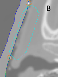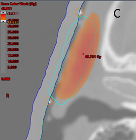 D Halfway through treatment, the patient complained to the nurse of irritation within the external auditory canal (EAC). The nurse asked to see the planning axial CT showing dosimetry through the EAC with the dose wash option, this time set to 21.3 Gy, which is around half of the prescribed dose of 45 Gy. There is significant belling of the electron dose cloud into the EAC, which is lined by the epidermis, a hierarchically organised cell population. This is made worse by the air-filled EAC cavity as electrons can travel more freely in air than tissue. An acute radiation reaction of the skin in the EAC caused the symptoms.
