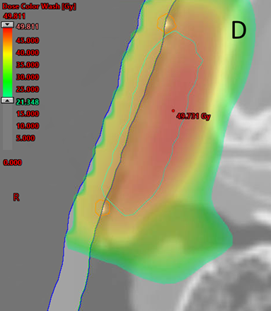 C Planning axial CT showing the dosimetry with the dose wash option set to 44.83 Gy. The prescribed dose was 45Gy. This was accepted by the RO and treatment started.