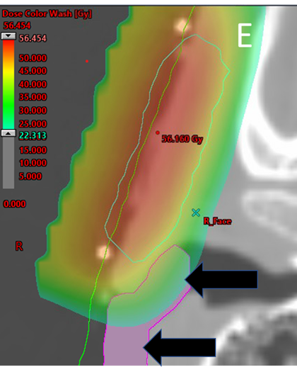 E The RO was consulted and the patient was replanned using a centimetre of bolus. The revised planning axial CT shows dosimetry through the EAC with the dose wash option also set to 21.3 Gy. This effectively lifted the dose out of the EAC yet maintained, and possibly improved, the PTV coverage. From that point on during treatment, pink stuff bolus (black arrows) was put into the EAC. This bolus ‘soaked up’ any excess dose that did find its way into the air cavity of the EAC, further minimising dose to the skin of the EAC. The situation was explained to the patient and treatment recommenced.