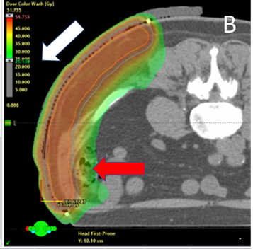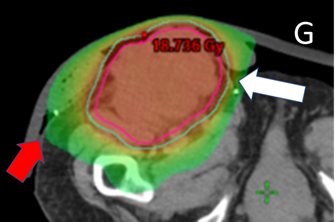 G The astute nurse asked for the screen shot G which shows the same scan but with the dosimetry with the dose wash set to half the phase 1 prescription dose that is, 9 Gy. The 9 Gy covers the skin medial (white arrow) and lateral (red arrow) to the tumour mass where the acute reaction of erythema in normal skin was observed. The nurse was able to explain to the patient, the family, and the institution that the red skin was radiation dermatitis, and that the exudate was tumour necrosis. This was a radiation reaction and not infection, saving the patient from an unnecessary course of antibiotics. Nursing interventions could include a swab to rule out any underlying infection and education for nursing home staff about the tumour necrosis exudate and its appropriate management.