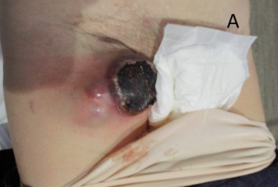 A Antero - lateral photo of a fungating groin lymph node of Merkel cell carcinoma (MCC) of unknown primary in a female patient. MCC is particularly radio sensitive.