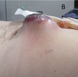 D An anterior clinical photo taken a week after the end of the first phase of palliative MV RT. There is a yellow exudate (white arrow) and the skin is red medially and laterally (black arrows) to the tumour mass. The nursing home where the patient resided was concerned that she had developed cellulitis.
