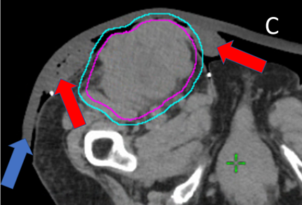 C Screen shot C shows the supine planning CT scan with an axial cut through the groin. The pink line is the GTV. The blue line shows the PTV. Note the bolus (blue arrow) over the whole of the area. This ensures the full MV photon dose to skin. Note the use of ‘pink stuff’ bolus (red arrows) under the main bolus to stop air gaps so that the skin’s surface will definitely be irradiated.