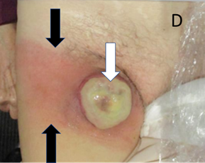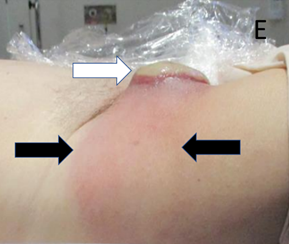 E E shows a lateral photo taken at the same time as D, showing the same yellow exudate (white arrow) and redness of the skin (black arrows). However, the reaction was linear, reminiscent of the planar way of treating with the linac as described in article three.3 Also the patient was well with no systemic signs of infection, such as fever and tachycardia.