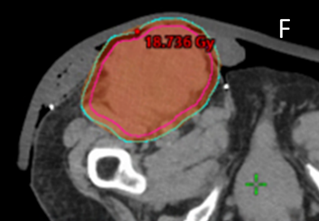 F Screen shot F shows the supine planning CT scan with an axial cut through the groin (as in C), but with the dosimetry with the dose wash set to the phase 1 prescription dose of 18Gy showing good conformity to the PTV. This plan was accepted by the RO.