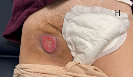 H Anterior photo H taken three weeks after the images in D and E. The tumour continues to resolve and there is now hyperpigmentation of the skin area previously thought to be cellulitis. This hyperpigmentation is significant compared to the contralateral unirradiated side and is typical of normal skin four weeks after a low dose of RT.