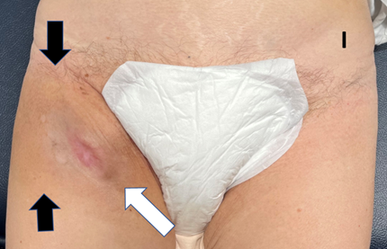 I G. Anterior photo I taken seven weeks after the completion of all RT showing that the Merkel lesion has resolved. The skin has closed (white arrow showing resolved ulcer). The hyperpigmentation continues to decrease (between the black arrows).