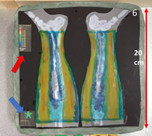Figure 6 Image of the surface of celebratory cake made by a nurse. The cake surface is 20 cm x 20 cm. This surface represents the dosimetry of a bilateral lower leg treatment for extensive skin field cancerisation complete with bolus, dose graticule (red arrow), and orientation cartoon (blue arrow).