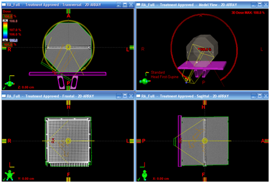 Mainly 2D ARRAY is applicable in the case of Quality Assurance of high energy beams. For each application range separate analysis software like Multi Check or Verisoft is required. Software is available to do analytical comparison of measurements versus dose distributions calculated by a treatment planning system. This software is used to convert 2D dose maps from TPS to gray scale virtual films. It will be represented on the screen of the personal computer with the locations of the 729 ion chambers superimposed over the gray scale image. The measuring system consists of 2D ARRAY Seven29 T10024, ARRAY INTERFACE T16026, RS232 Cable T22373/K67-30 and Matrix Scan Software S080050.9