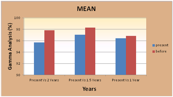 The average gamma pass percentage of present measurement and measurements before 2 years is 95.7 and 97.84; for 1.5 years is 97.02 and 98.28; for 1 year is 96.42 and 96.86 respectively. The result is cited in Table 1. Average response of gamma analysis for a period of 2 years, 1.5 years and 1 year is given in Figure 2.