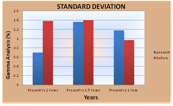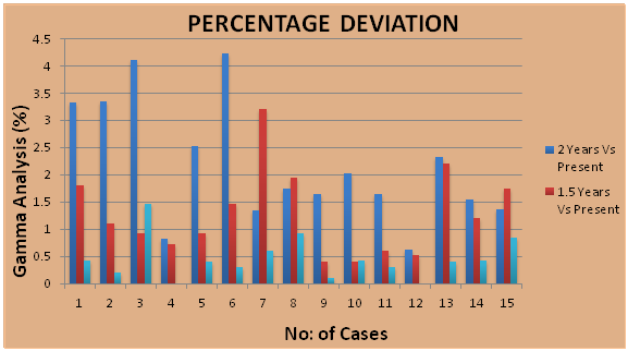 The plans which passed the gamma analysis (with percentage more than 95) were evaluated. Higher gamma passing criteria where observed for all analyzed plans, when analysis done before 2 years, 1.5 years and 1 year. Response of 2D array for the set of patients treated before 2years, 1.5years and 1 year Vs Present is given respectively in Table 1, 2 & 3. Standard Deviation of gamma pass percentage before 2 years is 1.38 and for present measurement is 0.70. Standard Deviation of gamma pass percentage before 1.5 years is 1.4 and for present measurement is 1.36. Standard Deviation of gamma pass percentage before 1 year is 0.97 and for present measurement is 1.18. Standard Deviation and percentage deviation of gamma pass percentage for present measurement Vs 2 years, 1.5 years and 1 year were given graphically in Figure 4 & Figure 5 respectively.