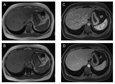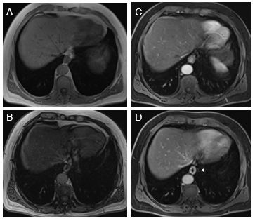 Figure 1 Axial T1-weighted GRE images. In-phase (A) and out-of-phase (B), exhibit signal drop of liver on out-of-phase images consistent with moderate steatosis. Moderately severely increased distal esophagus enhancement is well appreciated in the interstitial phase (arrow, D). The increased enhancement is suboptimal in the arterial phase images (C).
