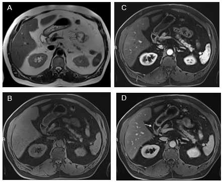 Figure 3 Fatty liver with simultaneous upper GI inflammation. Axial T2-weighted images (A). Axial T1-weighted GRE images pre-contrast (B) and acquired in the arterial phase (C) and the interstitial phase (D). Increased mural enhancement of the stomach, duodenum and jejunum is observed, and more conspicuous in the interstitial phase (arrows, D).