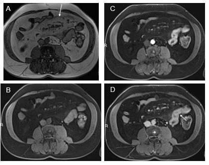 Figure 4 Increased jejunal enhancement and mesenteric panniculitis. Axial T1-weighted out-of-phase (a), pre-contrast (B), arterial phase (C), and interstitial phase (D) images. Out-of-phase images (A) exhibited the greatest clarity for depicting mesenteric panniculitis. On out-of-phase images, the mesenteric fat is mild gray in signal (arrow, A) and has definable margins against a background of higher signal peritoneal fat. Occasional subcentimeter lymph nodes are commonly seen. Note on arterial phase image the mesenteric panniculitis is only minimally evident. Note the increase spacing of jejunal loops (similar to fatty proliferation in Crohn's disease) and the enhancement of bowel is readily seen in the arterial images (C) which become more evident in interstitial phase images (arrow, D).
