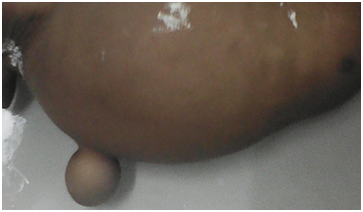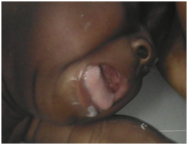 A 8month-old male Infant, from Ivory Coast, born out of a non-consanguineous marriage, 2nd of a sibling of 2 children with an elder brother of 3years without anomaly. He is from a non-follow-up pregnancy. He admitted in an array of chronic constipation, bloated stomach with few foods vomiting evolving since the age of four (04)months. There was no bilious vomiting or stoppage of matter and gases. Parents testified there was a delay in the emission of meconium at the 48th hour. Physical examination showed an infant presenting slender limbs, weighing 8Kg with general condition little altered (no delay in weight or psychomotor), macroglossia present since birth (Figure 1), unstressed umbilical hernia (Figure 2) with a small hernial sac, no malformation of the nervous system or bone skeleton, abdomen supple and depressible, distended with diffuse tympanism, without collateral venous circulation, mass and defense. There was no anal imperforation and anorectal stimulation was not accompanied with stool emission.