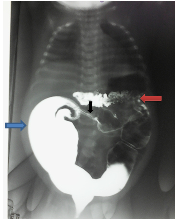 Figure 4 Barium enema showing transverse colon atresia segment (black arrow), the dilated upstream colon (blue arrow) and the downstream colon of reduced size (red arrow).