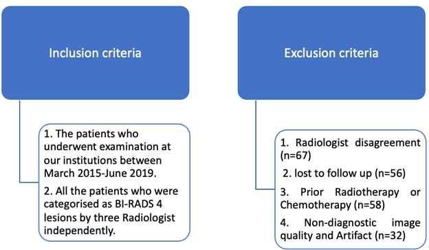 Exclusion criteria: Those patients who have lost follow-up, BI-RADS categorization disagreement among radiologists, those patients who have received prior treatment, poor image quality, or no true lesion were excluded from the study. (Figure 1)