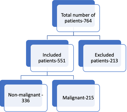Out of 764 female patients, 551 patients were included in this study as true BI-RADS 4. 213 were excluded from the study due to radiologist disagreement (67 patients), loss to follow-up visit (56 patients), prior treatment either radiotherapy or chemotherapy (58 patients), non-diagnostic image quality and/ or artifact (32 patients). Of the total 551 included patients, malignant cases 39% (215 patients) were found to be malignant and 61% (336 patients) revealed nonmalignant findings which includes benign, inflammatory, or granulomatous lesions. (Figure 2) (Graph 1) (Table 1)