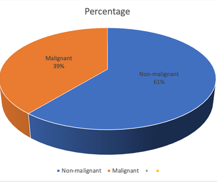 Our study resonates with this. Out of 551 included cases, 336 patients were found to be nonmalignant comprising 61%, fibroadenoma being the most common in 103 cases (18.7%), followed by fibrocystic change in 89 cases (16.2%), and the least common was fat necrosis in 8 cases (1.5%). 215 patients were found to be malignant comprising 39%. The most common malignant lesion was Ductal carcinoma in situ in 125 cases (22.7%) followed by invasive carcinoma in 45 cases (8.2%), and the least common was metastasis in 2 cases (0.3%).