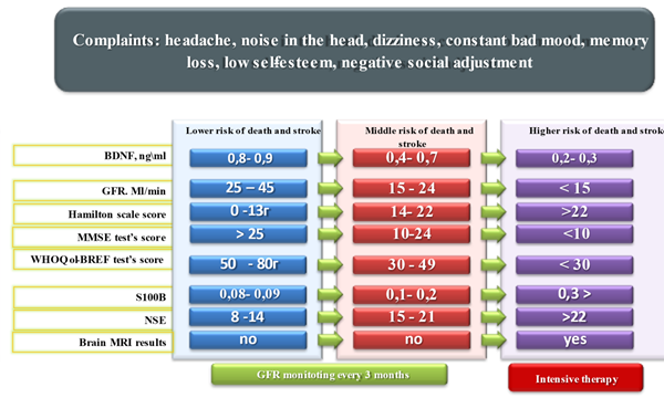 GFR less than 25 ml / min, hyperglycemia, elevated urea, creatinine, elevated cholesterol levels; reduced level of BDNF 0.4 -0.7 ng/ml, increased S100B0.1-0.2µg/l, increase in NSE from 15 to 21 ng / ml, the sum of points on the Hamilton scale from 14 to 22 points, the sum of points on the MMSE test from 10 to 20 points, the sum of points on the WHOQol-BREF questionnaire from 30 to 49 points |