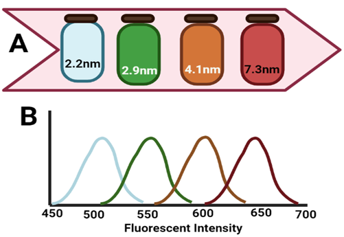 Figure 1 The quantum size ability causes CdSe QDs, which are distributed in chloroform, to have their optical characteristics tweaked. (A) Fluorescence picture of monodisperse QDs with sizes ranging from 2.2 to 7.3 nm following UV light. The same four QD samples' fluorescence spectra are shown in (B). Low variation in particle size is indicated by the observation of compact and symmetric emission bands.7 Created by BioRender.com.