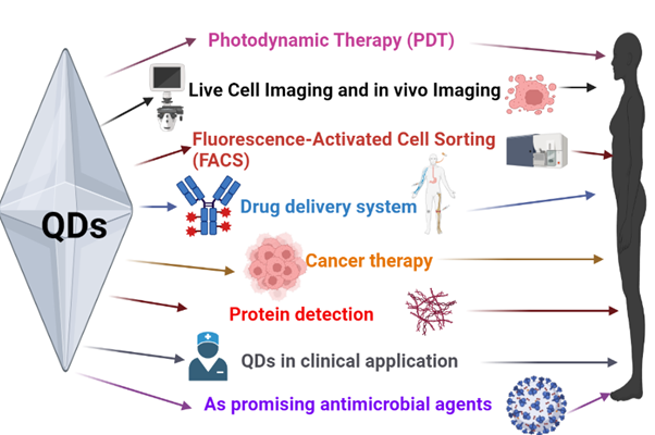 Quantum dots are artificial "droplets" of charge that might include a single electron or a group of thousands. Their normal sizes range from nanometres to a few microns, and employing cutting-edge nanofabrication technology, it is possible to precisely regulate their size, shape, and interactions. These special qualities have drawn a lot of interest in the biomedical community recently because they make it possible for real-time tissue imaging (bioimaging), diagnostics, single molecule probes, and medication administration, among many other applications. Due to their high brightness, photo bleach resistance, multiplexing ability, and high surface-to-volume ratio, quantum dots are ideal candidates for intracellular tracking, diagnostics, in vivo imaging, and therapeutic delivery. The optical properties of quantum dots can be tuned by size and composition. In the current paper, we will review properties, preparation, characteristics as well as biomedical applications. In addition, some issues along with future aspects. Furthermore, several commercially accessible alternatives are technically contrasted with QDs. Finally, we suggest technical factors that must be considered to enhance the clinical outcome of QDs.