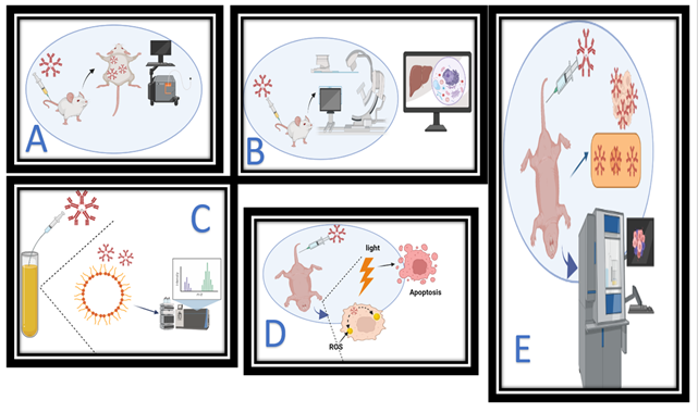 Figure 3 A few QD uses in biomedicine. (A) Imaging within cells. To see intracellular structures using fluorescence microscopy or confocal laser scanning microscopy, QDs are coated with targeting moieties (CLSM). In vivo imaging is (B). Using in vivo imaging equipment, QDs customised with tissue-specific targeting moieties may be utilised to see specific organs after injection (IVIS). (C) Cell sorting using fluorescence activation (FACS). During flow cytometry, QDs coated with cell-specific ligands can be utilised as fluorescent probes for cell sorting. QDs have a greater capacity for polychromatic cell sorting than traditional organic dyes because of their many benefits. Photodynamic treatment (D) (PDT). After exposure, QDs can function as photosensitizers or energy suppliers to other photosensitizers to produce reactive oxygen species (ROS) in situ, which causes apoptotic cell death when used as a cancer therapy. (E) Drug delivery systems that can be tracked. Thanks to their ultra-fine particle sizes, QDs may be employed as drug carriers to numerous tissues with high extravasation and tissue penetration capabilities. Since QDs have quantum qualities, it is simple to monitor their accumulation within target tissues. Created by BioRender.com.