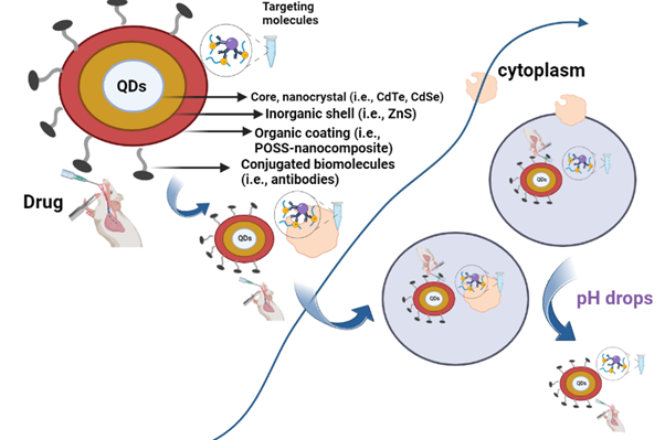 Due to its focus on the delivery mechanism and ability to distinguish between sick and healthy cells through metal affinity-driven self-assembly between synthetic polypeptides and semiconductor core QDs, QDs have relatively few side effects. As drug delivery methods, QDs offer several appealing qualities, including as their simplicity of production, versatility in drug conjugation, comparable physicochemical characteristics, and intriguing optical properties that make them traceable drug carriers which, upon administration, may be conveniently tracked.33 Principle of traceable medication delivery to tumours utilising QDs. To achieve the significant tumor accumulation required for cancer therapy, PEGylation is commonly used to prolong the circulation time after intravenous administration. The fabricated QDs exhibited high stability and biosafety as well as blue photoluminescence and pH-responsive drug release under physiological condition.34 Figure 4 shows how drug delivery is done with the help of QDs.