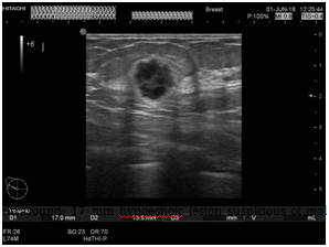 Figure 2 Beast ultrasound: 17mm hypoechoic lesion suspicious of malignancy at 10 o’clock position of right breast.