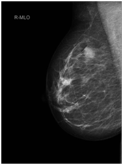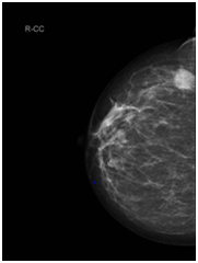 CC (Cranial-Caudal) & MLO (Medio-lateral-oblique) views of right mammogram indicating 17mm suspicious lesion in the OUQ (Outer Upper Quadrant).