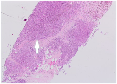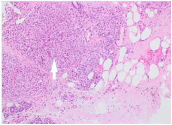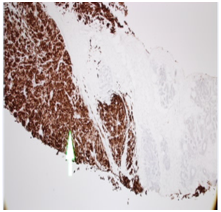 A 43years old white premenopausal female patient admitted though Emergency Department with a recent history of unwell feeling in addition to sudden onset of dizziness, ataxia, vomiting & loss of vision on right eye. Initial clinical assessment revealed loss of coordination, as well as blind right eye and partial unilateral deafness. The patient partner pointed to a smaller pigmented nevus in the anterior chest wall which started to be darker recently. Clinically, there is bilateral indeterminate scattered breast modularity and a small breast lump at the outer upper quadrant of the right breast measures about 30mm. Mammogram and breast US showed bilateral scattered irregular hypo echoic suspicious lesions measures between 5mm & 20mm , graded as M4U4. [BI-RADS: Breast Imaging Reporting and Data System]. A core biopsy was taken from the largest lesion in the right breast (Figure 1) (Figure 2).