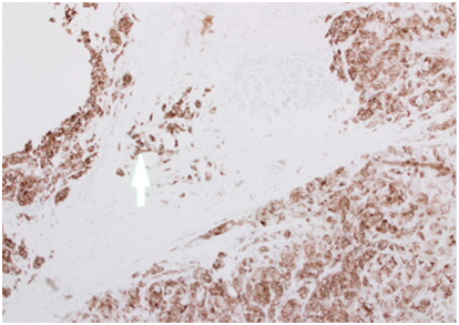 Also was positive for HMB45, which is a monoclonal antibody that reacts against an antigen present in melanomas. The specific antigen recognized by HMB-45 is now known as Pmel-17. No staining was detected for estrogens and progesterone receptors. It was negative for CK7 & CK20 which are characteristic markers for the glandular epithelia. Also was negative for Cam5.2 which is, anti-Cytokeratin stains most epithelial-derived tissue, including liver, renal tubular epithelium, and hepatocellular and renal cell carcinomas.