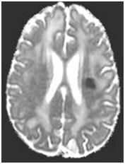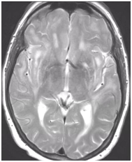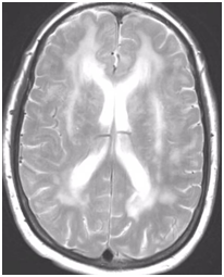 Figure 1 T2w axial image at the level of corona radiata demonstrates confluent hyperintense signal abnormality in the deep and subcortical cerebral white matter.