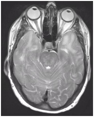 Figure 5 Relatively symmetric hyperintense T2 signal involving the external capsules, on both sides.