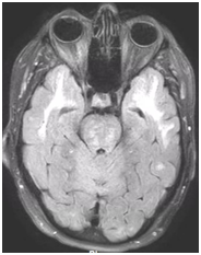 Figure 4 FLAIR axial image demonstrates hyperintense signal in white matter in anterior temporal lobes, on both sides which is more conspicuously seen compared to T2 signal seen on Figure 3.