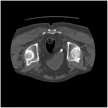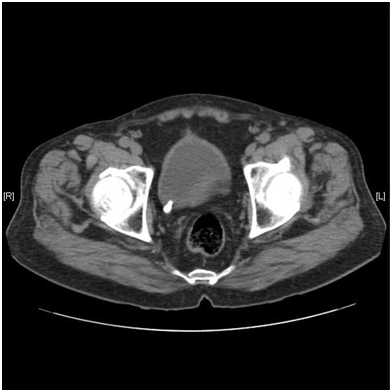 A 70year male presented to us with complaints of dysuria. There was no history of flank pain. He was a known asthmatic and had undergone transurethral resection of prostate 7years back. Physical examination was unremarkable. Urinalysis showed >100 pus cells per high power field. Urine was sent for culture. Routine biochemical parameters were normal. Ultrasonography showed a calculus at the right ureterovesical junction. An unenhanced helical CT scan was done which showed a right ureterovesical calculus of size 10mm and density 450HU (Figure 1). There was no hydronephrosis, hydroureter, perinephric or periureteral stranding. The CT was repeated in the prone position to differentiate whether it was calculus at the ureterovesical junction or if it was calculus in the bladder lying near the ureterovesical junction. The prone scan showed no change in the position of the calculus (Figure 2), which led to the conclusion that it was an ureterovesical junction calculus. Ureterorenoscopy was planned. However, on cystoscopy it was found that the calculus was not at the ureterovesical junction but was in a paraureteral diverticulum having a narrow mouth. It was dealt with by fragmentation using pneumatic lithotripsy and then removing the fragments.