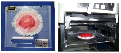 A 20 x 20cm2 square field isodose pattern in the mid-plane available in 2dimension pattern is traced. Radial lines are drawn to represent field decrement at the position of shadow tray at 48cm from source plane. At 50 % isodose line, a ‘chord line’ was drawn to achieve final flat isodose pattern. The amount of variable distance is transferred at the position of shadow tray, and a card board negative is obtained, in 2dimensions. By revolving around the centre point, a ‘proto-type thermocole flattening filter’ ‘cut out’ is obtained. Using low density dental impression wax (physical density ρ=1 gm/cm3) a diminished size ‘positive FF’ is fabricated. This is mounted on a 10mm thick filter tray originally supplied by the manufacturer. The designed FF and how its mounting arrangements during treatments are shown in Figure 1(a,b).