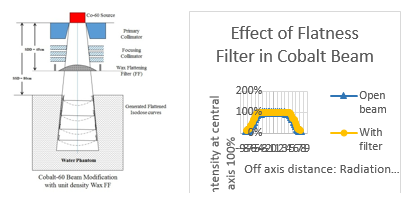 Flat field has clinical importance, because when multiple fields try to give combined contributions, due to rounded isodose pattern in cobalt beam, there are higher in homogeneity in the treated volume, and some tumor clonogens will receive doses different by about 5-10%. This might be overcome, if we have a flattened beam as a hypothetical model. A 2.4cm central thickness of wax reduces the beam intensity (10-12% because, for cobalt beam a transmission loss of 5.5 % per cm of unit density material). Further, as we used a thick original shadow tray, providing additional 10% attenuation, effectively the overall transmission factor became 0.805. By accounting for density effect, we plan to have a thin Aluminum flatness filter (ρAl =2.70gm/cm3) instead of wax FF. If there is annular clear space below filter mount, then we can overcome the 10% loss of intensity.