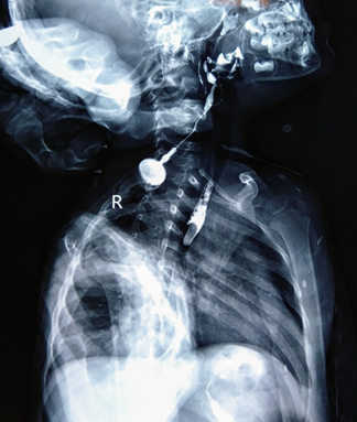 A contrast study was done by injecting iodinated contrast medium through the external opening, which revealed an irregular tract with beaded appearance on right side of neck extending cranially into the right lateral wall of oropharynx. Esophagus and stomach too showed the swallowed contrast, confirming the diagnosis of complete second arch branchial fistula.