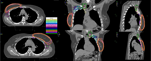 Ethics approval was obtained via Austin Health Human Research Ethics Committee (LNR/16/Austin/95). This prospective study has identified eight patients (four right-sided and four left-sided) with ESBC that had planning CT scans completed between February 2016 and April 2016. Three radiation oncologists (ROs) specialising in breast RT used the ESTRO guidelines while delineating the target volumes for each patient and then, again used the RTOG atlas while they contoured the same volumes for the same patients without any prior formalised training using either guideline. Contoured structures included CTVp_Breast (breast clinical target volume), CTVn_SCF (supraclavicular nodal clinical target volume, ESTRO guidelines have defined it as CTVn_L4), CTVn_L1 (axillary level 1 nodal clinical target volume), CTVn_L2 (axillary level 2 nodal clinical target volume, including interpectoral lymph nodes), CTVn_L3 (axillary level 3 nodal clinical target volume), CTVn_IMN (internal mammary nodal clinical target volume). This will create a total of 16 data sets for each RO (total of 48 datasets).