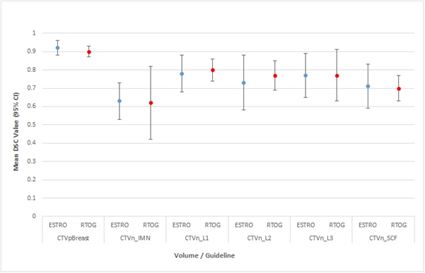 Results: The breast CTV contours showed the highest level of agreement between the ROs within each guideline (ESTRO DSC mean 0.92±0.04 and RTOG DSC mean 0.90±0.03). Due to the small standard deviation in DSC values, this difference of 0.02 was found to be statistically significant (p=0.031). The mean DSC for CTVn_IMN was 0.63 (±0.10) for ESTRO and 0.62 (±0.20) for RTOG guidelines, showing the least level of agreement for both guidelines. Within the axillary nodal volumes, level 1 showed the greatest agreement among the ROs for both ESTRO and RTOG guidelines with a mean DSC of 0.81 (±0.08) & 0.82 (±0.06) respectively. The range of mean DSC values for ESTRO and RTOG guidelines was 0.66-0.92 and 0.62-0.90 respectively.