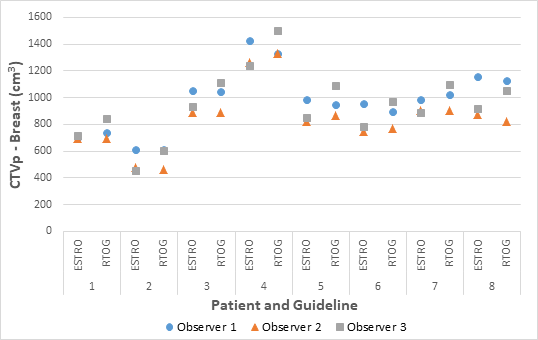 Ultimately, our aim of this study was to understand how best we could improve our quality of radiotherapy by ensuring consistency in target volume contouring given our advancing ability to in precise delivery techniques. Only the CTVp_Breast volume suggested greater RO consistency with the ESTRO guidelines, although the discrepancy was very small and unlikely to be of clinical significance. Overall, there was no evidence to suggest that using either the ESTRO or RTOG delineating guideline was superior in regards to greater consistency of delineating breast and nodal target volumes in ESBC patients (Appendix 1).