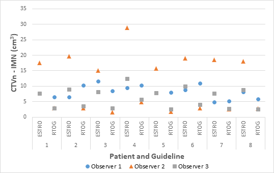 Methods: Three ROs contoured breast clinical target volumes (CTVs), axillary lymph node levels 1-3, supraclavicular and internal mammary nodal (CTVn_IMN) volumes for 8 post-operative patients using the ESTRO and RTOG guidelines for each patient. The inter-observer variability in contouring was measured by the generalized Dice Similarity Coefficient (DSC). Mean DSC values were calculated to compare the common volume accuracy between observers.ss