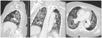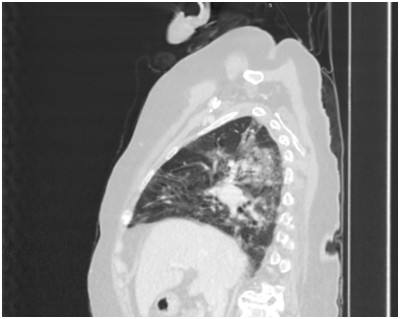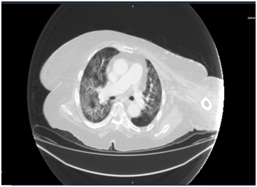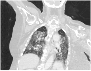 A case reported in Swat, Pakistan, a patient was referred from the Emergency Surgical Unit to the Radiology Department for CT scans of the chest and abdomen. She had previous surgery for CA –Stomach. She was having dyspepsia, heartburn and epigastric discomfort. After full history was taken, the CT was performed and findings were that of pneumonia, possibly Covid-19. As shown in Figures 1‒4. While the CT was being interpreted, the Radiologist contacted the patient’s attendant to inquire about the patient’s travel history. Relatives confirmed the patient had recently travelled to Malaysia. A nasopharyngeal swab was performed on the patient and sent for PCR which turned out to be COVID-19 positive. The two CT technicians were then quarantined for 14 days and other precautionary measures for infection control was done.4 The patient was referred to COVID -19 OPD in Saidu Teaching Hospital. But died a week later, his funeral was attended by approximately 200 people. Later that day, 16 of the attendees were determined to have Covid 19, and all were quarantined.