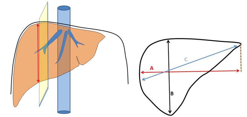 At present, the linear measurements of the liver are included in the actual diagnostic ultrasound scan protocol. The liver is commonly measured during a routine upper abdominal ultrasound. Measurement of liver size using ultrasound is most often determined by taking a simple linear measurements of the liver from a plane along the mid-clavicular line, and using cut off values to differentiate normal from abnormal liver size.6 One measurement of liver size is done in the mid-clavicular line from highest peak of the right hemidiaphragm down to the caudal liver end (maximal cranio-caudal diametr-Max CC). This has a maximum dimension 18cm. Another possibility to measure the liver size is in the mid-clavicular line to measure cranio-caudal dimension (CC) and antero-posterior dimension (AP). The maximum CC is 15cm and AP 13cm, maximum for both dimensions together is 28cm.5,7,8