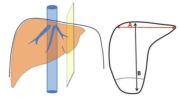 Figure 1 Schematic representation of the liver right lobe section to measure the cranio-caudal size of the right lobe (CCRL, A), antero-posterior diameter of the right lobe (APRL, B), and maximal cranio-caudal diameter of the right lobe (maxCCRL).