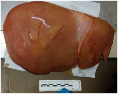 The average weight of liver according to results of post-mortem weighing was 1607±562g. The average volume of the liver estimated using water displacement method, was 1434±503ml. In all cases, the liver weight (in grams) exceeds the amount of liver volume (in milliliters). The average density of liver tissue was 1.14±0.16g\ml.