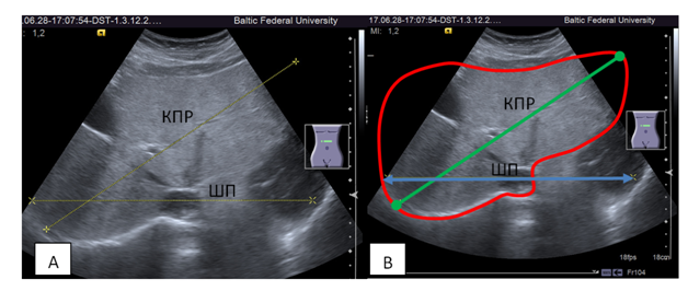 Figure 4 A: Ultrasound cross section of the liver trough subcostal access. ШП, width of the liver measured in horizontal plane (TransL), КПР, oblique transverse diameter (the most remote point of the right dome of the diaphragm and the left border of the liver). B: The same image. The borders of the liver are outlined. The ШП (TransL) do not fit in the image.