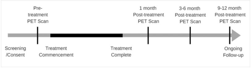 Radiotherapy was delivered using an intensity modulated radiotherapy (IMRT) technique. A planned primary tumour dose of 54Gy was delivered five days a week over five to six weeks. All patients received daily pre–treatment imaging using cone beam CT (CBCT), with all shifts actioned via remote couch adjustment with a zero–action threshold. Radiotherapy was completed as prescribed in all but one patient, where treatment ceased at fraction 27 of 30 due to acute toxicity. All patients were reviewed one month following completion of radiotherapy, and thereafter every three to six months by a radiation oncologist with MRI and PET imaging and clinical examination as per standard departmental practice (Figure 1).